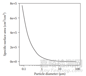 圖 2 比表面積和粒度的函數(shù)關(guān)系(參考文獻(xiàn)2)