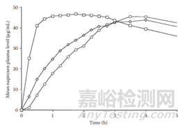 圖4 不同制劑策略的萘普生口服給藥后的血藥濃度-時(shí)間曲線(<o>曲線為萘普生片劑;<à>曲線為萘普生混懸液;<ÿ>曲線為納米晶混懸液)(參考文獻(xiàn)2)