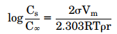 其中Cs是飽和溶解度,C¥是由大顆粒組成的固體的溶解度,s是固體物質(zhì)的界面張力,Vm是顆粒的摩爾體積,R是氣體常數(shù),T是絕對(duì)溫度,r是固體的密度,r是顆粒半徑。