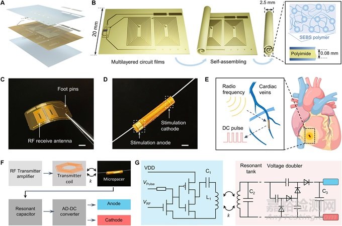 研究人員開發(fā)出一種自組裝的可植入微管式起搏器,該起搏器輕巧且無需導(dǎo)線,能夠?yàn)檠軆?nèi)心肌起搏和機(jī)械耦合提供高電輸出和操作穩(wěn)定性。這種微管起搏器旨在減少由于裝置固定在心肌上而造成的機(jī)械負(fù)擔(dān)以及與起搏導(dǎo)線相關(guān)的醫(yī)療并發(fā)癥。無線射頻模塊嵌入在薄柔性聚酰亞胺膜中,用于接收外部發(fā)射器的電力傳輸。聚酰亞胺膜用彈性體層封裝,與電路絕緣。這種封裝為用于血管內(nèi)部署和植入的微管裝置的滾動(dòng)自組裝過程提供了粘性。