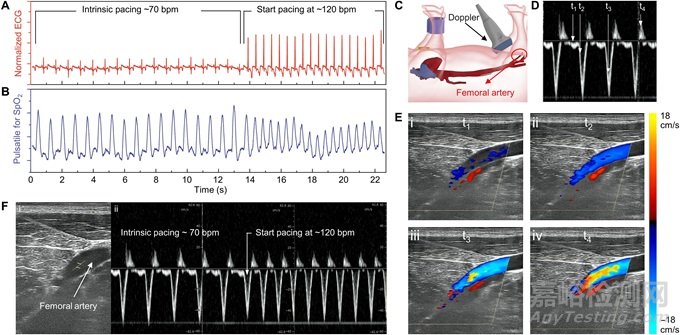 A)、B) ECG 和 SpO 2監(jiān)測響應(yīng) 70 至 120 bpm 的心臟收縮。C) 示意圖說明了雙工超聲的放置以及所檢測到股動(dòng)脈血流。D) 脈沖波多普勒檢測到響應(yīng)心臟收縮的脈動(dòng)動(dòng)脈血流。E) t1至t4表示不同心動(dòng)周期的多普勒信號。t1對應(yīng)舒張期,t2對應(yīng)收縮早期,t3對應(yīng)收縮中期,t4對應(yīng)收縮末期。顏色梯度表示流向后肢的血流速度的方向和大小。F)脈沖波多普勒檢測到股動(dòng)脈血流量響應(yīng) 70 至 120 bpm 的心臟起搏。