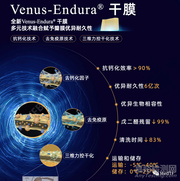 其次是結(jié)構(gòu)性瓣膜衰敗(Structural Valve Degeneration,SVD)的問題。生物瓣膜植入人體后,可能會發(fā)生結(jié)構(gòu)性瓣膜衰敗,且這個過程不可逆。傳統(tǒng)生物瓣采用戊二醛處理易造成鈣化,影響瓣膜使用壽命。這點上,愛德華采用的是RESILIA TISSUE,一種經(jīng)過特殊的甘油化處理的心包組織,在臨床上使用較久,7年隨訪數(shù)據(jù)顯示,SVD發(fā)生率較低(99.3%無SVD)。Venus-Vitae采用獨特的Venus-Endura技術(shù),抗鈣化能力更強、血流動力學(xué)效果更好,保存過程中瓣葉不會因脫水導(dǎo)致機械性能受損,具有較長的耐久性。