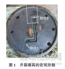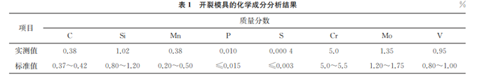 采用直讀光譜分析儀對(duì)開裂模具進(jìn)行化學(xué)成分分析,結(jié)果如表1所示。由表1可知:開裂模具的化學(xué)成分滿足標(biāo)準(zhǔn)要求。