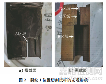 開裂模具的宏觀形貌如圖1所示,模具外觀尺寸為200mm×60mm(外徑×壁厚)。圖1中兩處白色箭頭所指處存在開裂裂紋。使用線切割方法在垂直于裂紋1位置截取試樣并進(jìn)行宏觀觀察,結(jié)果如圖2所示。由圖2可知:裂紋起始于型腔的拐角處,并向外擴(kuò)展,裂紋長度為5mm;該擠壓模具存在3處變徑區(qū)域,分別為B、C、D區(qū)域。