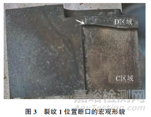 沿裂紋1人工打開模具,對(duì)斷口進(jìn)行宏觀觀察,結(jié)果如圖3所示。由圖3可知:斷口為典型的疲勞斷口,呈“海灘”狀條紋特征;斷口分為裂紋源區(qū)、裂紋擴(kuò)展區(qū)及瞬斷區(qū),裂紋源區(qū)如箭頭所指,始于C區(qū)域到D區(qū)域的臺(tái)階位置,且為拐角處;C區(qū)域和臺(tái)階位置均為電火花加工面,表面粗糙。