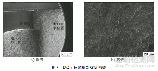 在裂紋1斷口處取樣,并對(duì)試樣進(jìn)行SEM分析,結(jié)果如圖5所示。由圖5可知:裂紋源起始位置與宏觀觀察結(jié)果一致,裂紋擴(kuò)展區(qū)形貌呈準(zhǔn)解理特征,說明材料具有較好的韌性。