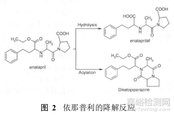 例如抗高血壓藥物依那普利,其結(jié)構(gòu)中含有羧酸乙酯基,該基團(tuán)易發(fā)生水解反應(yīng),生成羧基,即產(chǎn)生依那普利拉;此外,依那普利的結(jié)構(gòu)中含有 1 個(gè)羧基,同時(shí)還含有 1個(gè)氨基,它們易發(fā)生酰化反應(yīng)生成內(nèi)酰胺結(jié)構(gòu),即產(chǎn)生依那普利二酮哌嗪。見圖 2。