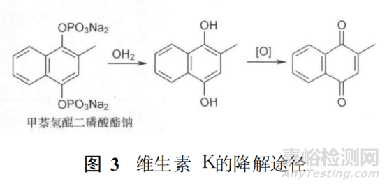 例如,維生素 K的人工合成品甲萘氫醌二磷酸酯鈉,在一定 pH值水解條件下,首先生成甲萘氫醌;進(jìn)而在氧化條件下,甲萘氫醌發(fā)生氧化反應(yīng),生成甲萘醌,反應(yīng)過程見圖 3。
