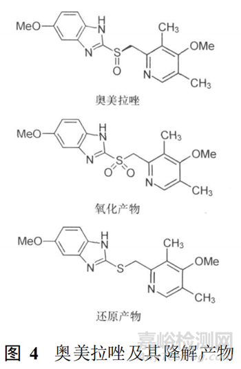 如 《中國(guó)藥典》收載的奧美拉唑質(zhì)量標(biāo)準(zhǔn)中采用 HPLC檢測(cè)方法于 280 nm進(jìn)行有關(guān)物質(zhì)的測(cè)定,分析該檢測(cè)條件主要是檢測(cè)奧美拉唑的氧化產(chǎn)物奧美拉唑磺?;?,但英國(guó)藥典標(biāo)準(zhǔn)在此基礎(chǔ)上專門列出了 TLC方法進(jìn)行奧美拉唑還原產(chǎn)物的測(cè)定。