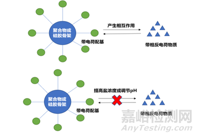 首先使待分析物和固定相帶有不同電荷,產(chǎn)生相互作用,然后通過增加離子強度破壞兩者的相互作用(鹽濃度梯度)或者調(diào)節(jié)pH改變待分析組分表面電荷(pH梯度)來打破這種離子相互作用,實現(xiàn)洗脫目的,見圖1。