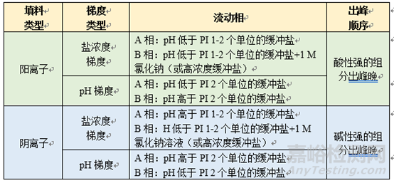 ①在鹽濃度梯度條件下,pH為單一值,多為PI±1。陰離子模式下,pH為PI+1,因為陰離子交換柱填料帶正電荷,當(dāng)流動相pH高于PI時待分析物帶負(fù)電荷,可以與柱填料產(chǎn)生相互作用而被保留,然后隨著鹽濃度增加逐漸解析下來;相反,陽離子模式下,pH為PI-1,因為陽離子交換柱填料帶負(fù)電荷,當(dāng)流動相pH低于PI時待分析物帶正電荷,可以與柱填料產(chǎn)生相互作用而被保留,然后隨著鹽濃度增加逐漸解析下來。