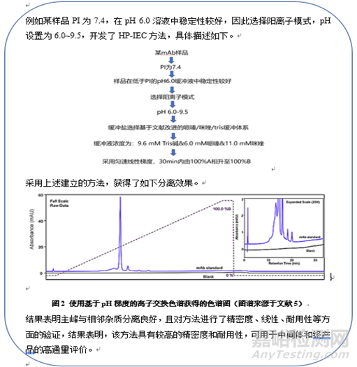 ②在pH梯度條件下,pH范圍設(shè)置通常PI-2~PI+2,可依據(jù)雜質(zhì)出峰時間和分離情況進一步優(yōu)化。陰離子模式下,pH由高到低,因為陰離子交換柱填料帶正電荷,當(dāng)流動相pH高于PI時待分析物帶負(fù)電荷,可以與柱填料產(chǎn)生相互作用而被保留,然后隨著pH逐漸降低,帶分析物的負(fù)電荷逐漸被中和,從而洗脫下來;陽離子模式下,pH由低到高,因為陽離子交換柱填料帶負(fù)電荷,當(dāng)流動相pH低于PI時待分析物帶正電荷,可以與柱填料產(chǎn)生相互作用而被保留,然后隨著pH逐漸降低,待分析物的正電荷逐漸被中和,從而洗脫下來。