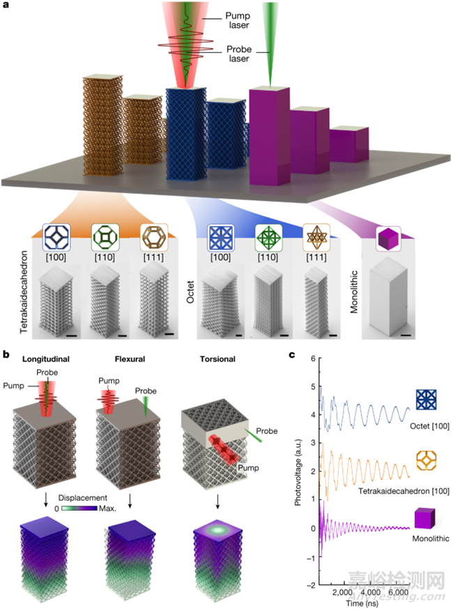 為了在微尺度上對(duì)超材料進(jìn)行高通量、非破壞性的表征,作者設(shè)計(jì)了一種基于脈沖激光的技術(shù),利用光聲激發(fā)材料樣品表面的彈性波,類似于光聲薄膜和多晶金屬表征研究。激光誘導(dǎo)共振聲學(xué)光譜法(LIRAS)由兩個(gè)獨(dú)立的泵浦和探頭模塊組成(圖 1a)。泵浦模塊包括一個(gè)皮秒脈沖激光器,該激光器應(yīng)用于帶有薄鉻涂層的三維樣品,該鉻涂層可部分吸收激光脈沖并誘導(dǎo)寬帶聲波。然后,由相位掩膜干涉儀組成的探頭模塊測(cè)量由此產(chǎn)生的樣品表面位移。為了便于提取超材料的機(jī)械特性,作者使用雙光子光刻系統(tǒng)以細(xì)長(zhǎng)的縱橫比制作了 IP-Dip 光刻膠聚合物微晶格。利用這些經(jīng)典幾何結(jié)構(gòu)中的立方對(duì)稱性,可通過(guò)沿[100]、[110]和[111]等晶格取向制作超材料樣品以及單片 IP-Dip 聚合物樣品進(jìn)行比較,從而實(shí)現(xiàn)超材料各向異性檢測(cè)(圖 1a 中的插圖)。