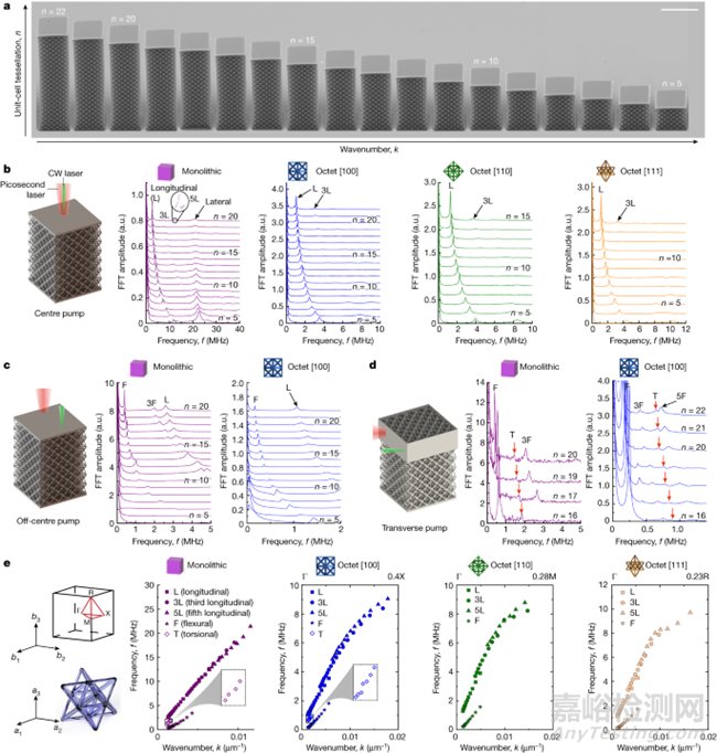 在玻璃基底上制作超材料會(huì)在基底和頂部分別產(chǎn)生鉗位和自由邊界條件,從而在激光激勵(lì)下產(chǎn)生波長(zhǎng)為 λ = 4H/m 的駐波。因此,改變樣品高度可實(shí)現(xiàn)波矢 k 的可調(diào)諧性,波矢 k 的大小定義為波長(zhǎng) |k| = 1/λ。通過(guò)制作和測(cè)試高度不斷增加的樣品,可以提取出不同波矢的共振頻率(圖 2a)。在每個(gè)樣品受到104個(gè)泵浦激光脈沖激發(fā)后,通過(guò)快速傅立葉變換(FFT)提取超材料時(shí)域動(dòng)態(tài)響應(yīng)的頻率內(nèi)容。利用中心泵-CW 探針?lè)桨福骱未_定了所有 5 × 5 × n 樣品(圖 2b )的基本縱向模式峰值。除了這個(gè)主峰外,大多數(shù)樣品(如圖 2b 中的 3L 和 5L)還能測(cè)量到高階諧波。作者還在單片樣品中測(cè)量到了與高度無(wú)關(guān)的泊松效應(yīng)橫向模式,而在超材料中無(wú)法測(cè)量到這種模式,因?yàn)樵谶@種較短的波長(zhǎng)范圍內(nèi),微結(jié)構(gòu)散射非常明顯。利用偏離中心的泵-CW 探針?lè)桨?,作者主要激發(fā)了撓曲模式以及較弱的縱向模式(圖 2c)。為了測(cè)量扭轉(zhuǎn)模式,作者采用了橫向泵-波探針?lè)桨?,即在超材料樣品的?cè)面制作一個(gè)平面反射面,并在該表面的兩個(gè)不同橫向位置進(jìn)行泵和探針(見(jiàn)圖 2d)。這種方案主要激發(fā)撓曲模式,但也能測(cè)量扭轉(zhuǎn)模式。