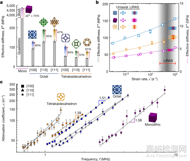 雖然利用 LIRAS 技術(shù)獲得的頻散關(guān)系有助于深入了解這些超材料所支持的不同類型的彈性波,但最終目標(biāo)是利用這些信息來(lái)確定它們的動(dòng)態(tài)機(jī)械特性。通過(guò)位移校準(zhǔn) LIRAS 實(shí)驗(yàn),確定了整體聚合物和單片聚合物的特征均方根應(yīng)變率以及八元超材料的特征均方根(r.m.s)應(yīng)變率,從而對(duì)應(yīng)于 MHz 超聲波動(dòng)態(tài)范圍。正如八面體和四開(kāi)十面體所預(yù)期的那樣,測(cè)得的有效剛度(圖 3a)顯示出與方向相關(guān)的數(shù)值。