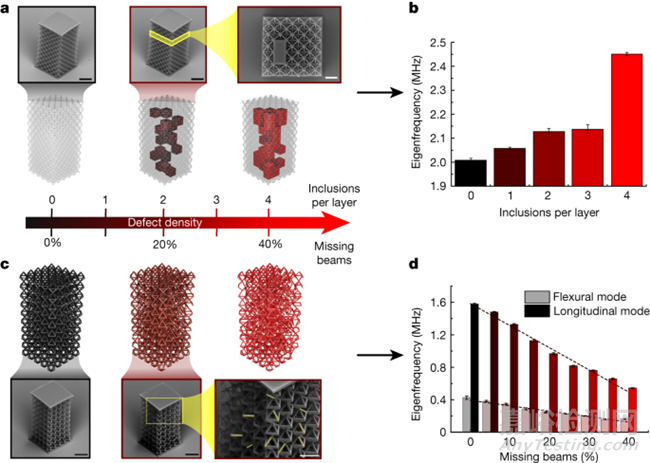 作為一種替代方法,本文使用 LIRAS 通過(guò)測(cè)量波傳播響應(yīng)的變化,對(duì)微觀樣品進(jìn)行高通量缺陷識(shí)別。具體來(lái)說(shuō),按照中心泵方案,我們確定了作為缺陷密度函數(shù)的共振頻率變化。為了驗(yàn)證這些能力,作者研究了固體夾雜物和缺失特征。為了模擬未聚合樹(shù)脂在樣品中滯留而造成的固體夾雜物缺陷,作者設(shè)計(jì)并制造了 5 × 5 × 10 八面體超材料,每個(gè)垂直細(xì)分層都有不同程度的立方體固體夾雜物(圖 5a)。作者將夾雜物的尺寸與大約 10 μm 的八面體單元尺寸相匹配,制作出了每層缺陷從零到四個(gè)不等的樣品,并測(cè)量了它們?cè)诩ぐl(fā)時(shí)的主要共振模式。這些實(shí)驗(yàn)發(fā)現(xiàn),當(dāng)每層的缺陷數(shù)在 1 到 3 個(gè)之間時(shí),共振頻率比無(wú)夾雜物的樣品提高了大約 2% 到 8% (圖 5b)。當(dāng)每層有四個(gè)夾雜物時(shí),共振頻率增加了 23%,這可能是由于累積的固體夾雜物在幾層中形成了固體疇,導(dǎo)致剛度明顯增加。