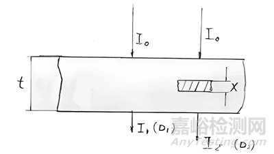 若有一束入射強(qiáng)度為I的X射線取某工件進(jìn)行探傷,假設(shè)工件內(nèi)部有一缺陷,其厚度為X,經(jīng)X射線透照拍片后,透過基本金屬部的X射線強(qiáng)度為I,其底片部位的黑度為D1,透過有缺陷部位的X射線強(qiáng)度為I,其底片部位的黑度為D2,因?yàn)榛窘饘倥c缺陷的密度不同,一般是D2>D1,則I2<I1。
