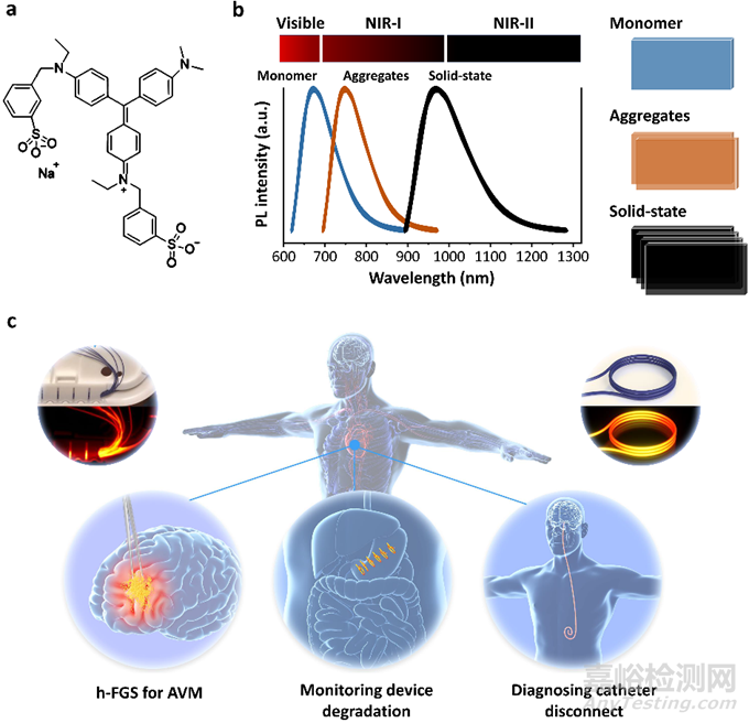 11月10日,首都醫(yī)科大學(xué)附屬北京天壇醫(yī)院的賈旺教授團(tuán)隊(duì)聯(lián)合中國(guó)科學(xué)院上海藥物研究所、中科院自動(dòng)化研究所、四川大學(xué)、武漢理工大學(xué)、斯坦福大學(xué)等多家研究機(jī)構(gòu)在《Advanced Science》期刊上發(fā)表題為“Clinically Translatable Solid-State Dye for NIR-II Imaging of Medical Devices”的研究論文。該研究聚焦醫(yī)療器械無(wú)法在體持續(xù)監(jiān)測(cè)的臨床問(wèn)題,巧妙選取并創(chuàng)新性地發(fā)現(xiàn)了國(guó)際上第一個(gè)能直接用于臨床的近紅外II區(qū)(NIR-II)固態(tài)下熒光化合物,通過(guò)系列性的動(dòng)物模型和臨床檢測(cè),提出了將該固態(tài)成像技術(shù)用于醫(yī)療器械涂層,可通過(guò)熒光無(wú)創(chuàng)監(jiān)測(cè)手術(shù)縫線在體降解、醫(yī)用導(dǎo)管在體斷裂等,另外可巧妙地與醫(yī)用栓塞材料融合應(yīng)用,固化后產(chǎn)生的熒光能實(shí)時(shí)引導(dǎo)醫(yī)生精準(zhǔn)切除血管畸形類病灶。該研究是一項(xiàng)醫(yī)工交叉融合、設(shè)計(jì)巧妙的創(chuàng)新研究,其想法源于臨床需求,繼而從臨床材料中發(fā)現(xiàn)其創(chuàng)新性性質(zhì),通過(guò)工科和材料研究闡明其科學(xué)機(jī)制,最后轉(zhuǎn)化回臨床創(chuàng)新應(yīng)用,充分體現(xiàn)了“Bedside-Bench-Bedside”的轉(zhuǎn)化醫(yī)學(xué)精髓。