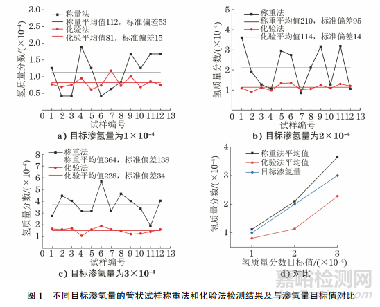 (1)對于管狀試樣,即氫含量較低時,稱重法檢測值的波動較大,而化驗法檢測值的波動相對較小,并且化驗法檢測的氫含量低于目標滲氫量,而稱重法檢測的結果接近目標滲氫量。
