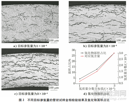 對不同氫含量管狀試樣進行金相檢驗,其顯微組織形貌如圖2所示。從圖2可以看出:其組織中有線條狀氫化物析出,并且隨著目標滲氫量的升高,其氫化物數(shù)量增加。當目標氫含量分別為1×10-4,2×10-4,3×10-4時,試樣中氫化物的面積占比分別約為4.3%,12.9%,27.2%,估算出其氫含量分別約為0.7×10-4,1.5×10-4,3×10-4。可以看出隨著目標滲氫量的增加,氫化物的占比和與之對應的氫含量均增加,表明其具有一定的正相關關系。