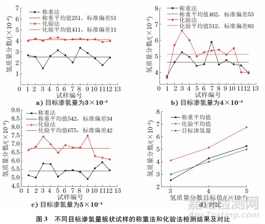 對于稱重法,不論是低氫含量還是高氫含量,其檢測結果均與目標值接近,但其檢測值波動較大仍然是不可避免的問題,這與設備的精度、試樣的質(zhì)量以及目標滲氫量的大小相關。因此,為了提高其精度,可適當增加其檢測試樣的數(shù)量。