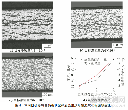 對不同氫含量板狀試樣進行金相檢驗,結果如圖4所示。從圖4可以看出:其組織中有粗大的線條狀氫化物,并且隨著目標滲氫量的升高,氫化物的數(shù)量增加,且變得細小均勻。當目標氫含量為3×10-4,4×10-4,5×10-4時,其氫化物的面積占比分別約為25.9%,30.6%,48.9%,估算其氫含量分別為3×10-4,5×10-4,7.9×10-4??梢钥闯?,當氫含量較高時,由于氫化物更加細小密集,因此利用金相法判斷鋯合金的氫含量存在較大偏差。