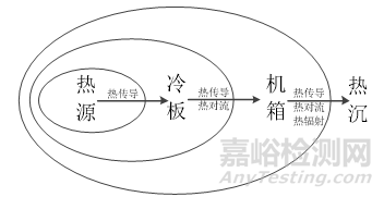 在軍用電子設(shè)備的熱設(shè)計(jì)結(jié)構(gòu)中,通常首先是將熱源熱量傳導(dǎo)至冷板結(jié)構(gòu)中,冷板作為熱源的一級(jí)導(dǎo)熱結(jié)構(gòu),第一時(shí)間對(duì)熱源起到散熱作用,冷板的導(dǎo)熱效率直接影響著整個(gè)熱設(shè)計(jì)結(jié)構(gòu)的散熱效率;冷板再經(jīng)傳導(dǎo)或?qū)α髋c設(shè)備機(jī)箱之間發(fā)生熱傳遞,將熱量從冷板結(jié)構(gòu)傳導(dǎo)至機(jī)箱結(jié)構(gòu)中,或是冷板熱量經(jīng)機(jī)箱內(nèi)的對(duì)流換熱散發(fā)到機(jī)箱內(nèi)部空間內(nèi);最后通過(guò)機(jī)箱與外界熱沉之間的傳導(dǎo)、對(duì)流、輻射,將機(jī)箱或其內(nèi)部熱量傳遞到設(shè)備外部,從而完成了設(shè)備內(nèi)部熱源與外界熱沉之間的熱交換,實(shí)現(xiàn)整機(jī)熱設(shè)計(jì)。不同整機(jī)結(jié)構(gòu)形式,其散熱結(jié)構(gòu)和路徑也不盡相同,軍用電子設(shè)備熱設(shè)計(jì)結(jié)構(gòu)中的典型熱量流向如圖2所示。