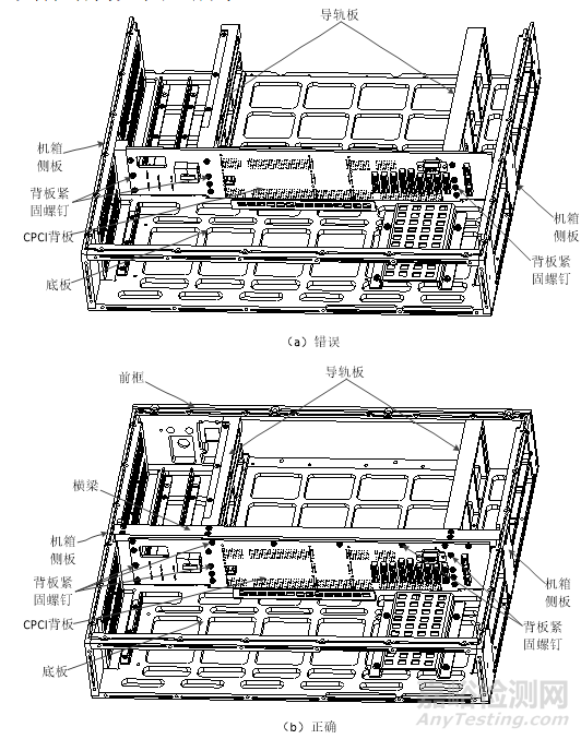 在圖4(a)中,CPCI背板通過(guò)緊固螺釘安裝在導(dǎo)軌板一端,但導(dǎo)軌板只與機(jī)箱底板之間連接,其穩(wěn)定性和剛性較弱,未與機(jī)箱形成一剛性整體,從而在產(chǎn)品使用或試驗(yàn)中,導(dǎo)軌板會(huì)借助CPCI背板結(jié)構(gòu)達(dá)到其整體穩(wěn)固性,導(dǎo)致失去了其作為CPCI背板安裝基體的意義。正確安裝結(jié)構(gòu)如圖4(b)所示,在導(dǎo)軌板前、后端增加前框、橫梁結(jié)構(gòu),把導(dǎo)軌板與機(jī)箱側(cè)板、底板裝聯(lián)一起,形成整體剛性結(jié)構(gòu)后再作為CPCI背板安裝基體,實(shí)現(xiàn)對(duì)CPCI背板的剛性固定,提升其安裝后的固有頻率和抗振性。