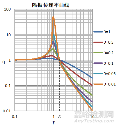 公式(1)中,η為系統(tǒng)隔振傳遞率,是系統(tǒng)結(jié)構(gòu)的響應(yīng)量值與外部激勵(lì)量值之比,D為系統(tǒng)阻尼比,其值與系統(tǒng)阻尼系數(shù)、質(zhì)量和剛度有關(guān),隨系統(tǒng)參數(shù)的改變而變化,是無(wú)量綱值,γ為頻率比,是外部激振頻率與固有頻率的比值。當(dāng)D值改變時(shí),隔振傳遞率η隨頻率比γ的變化曲線為隔振傳遞率曲線,如圖5所示。