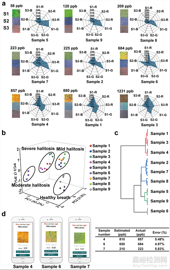 圖6. 將結(jié)構(gòu)色水凝膠應(yīng)用于口臭患者的臨床呼氣樣本,實(shí)現(xiàn)對口臭患者患有牙周炎的風(fēng)險(xiǎn)評估。