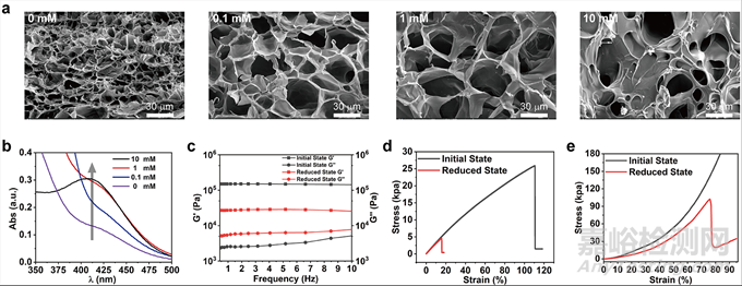 圖2. 水凝膠被還原后形貌、化學(xué)組成以及機(jī)械性能的變化。