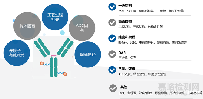 ADC產(chǎn)品關(guān)鍵質(zhì)量屬性(Critical Quality Attributes, CQA)舉例如下圖所示。根據(jù)先驗(yàn)知識(shí)和平臺(tái)經(jīng)驗(yàn),與分子安全性和有效性相關(guān)的物理、化學(xué)、生物或微生物性質(zhì)及特征,均可納入關(guān)鍵質(zhì)量屬性,且需隨產(chǎn)品開(kāi)發(fā)階段的進(jìn)步而不斷加深研究。ADC主要的關(guān)鍵質(zhì)量屬性包括一級(jí)結(jié)構(gòu)、高級(jí)結(jié)構(gòu)、純度與雜質(zhì)、載藥量與藥物分布(Drug-to-Antibody Ratio, DAR)、含量、效價(jià)以及其他必須的生物制品質(zhì)量屬性。