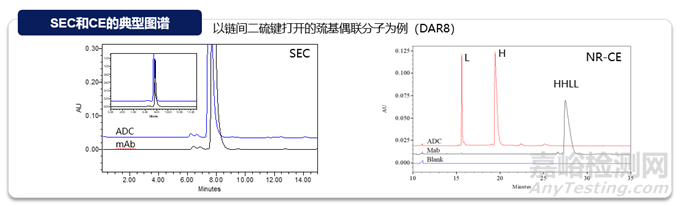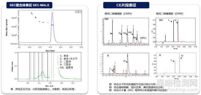 分子大小變異體(聚集體、片段等)是重要的質(zhì)量屬性,可直接影響蛋白質(zhì)療法的療效或安全性。聚集是蛋白質(zhì)最常見(jiàn)的物理降解途徑,且ADC比抗體更容易聚集,主要是因?yàn)樗幬?連接子分子的存在,使連接位點(diǎn)的局部表面具有更多的疏水性。與抗體分析的技術(shù)一致,體積排阻色譜(SEC)、光散射(SEC-MALS)等常規(guī)技術(shù)可用于支持ADC分子聚合體的分析表征,非還原/還原毛細(xì)管電泳(non-reduced/reduced Capillary Electrophoresis)可用于支持ADC片段的分析表征。