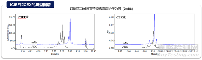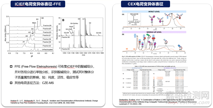 與抗體一致,ADC的電荷變異體是關(guān)鍵的質(zhì)量屬性,因?yàn)樗鼈儗?duì)穩(wěn)定性和生物活性有潛在影響。在ADC中可以觀察到各種形式的與電荷相關(guān)的異質(zhì)性,貢獻(xiàn)這些異質(zhì)性的因素包括抗體自身展示的電荷變異性、偶聯(lián)工藝過(guò)程引入的修飾、小分子藥物本身的結(jié)構(gòu)以及在不同偶聯(lián)位點(diǎn)引起的電荷變化等。常規(guī)分析技術(shù)如離子交換色譜(Ion Exchange Chromatography,IEX)或者等點(diǎn)聚焦電泳(iCIEF)可以實(shí)現(xiàn)電荷變異體的監(jiān)測(cè)。常規(guī)的電荷變異體表征策略也適用于ADC分子,富集單一變異體組分后,進(jìn)行完整水平(Top-down)、亞基水平(Middle-down)或肽段水平(bottom-up)質(zhì)譜解析。