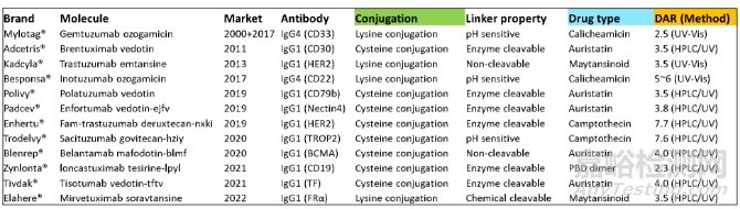 DAR(Drug-to-Antibody Ratio),即藥物小分子與抗體分子的數(shù)量比例,可指示平均每個(gè)抗體上偶聯(lián)上的小分子藥物個(gè)數(shù)。DAR與ADC的療效和安全性直接相關(guān),低載藥量(低DAR)會(huì)降低ADC的效力,而高載藥量(高DAR)會(huì)改變ADC分子的藥代動(dòng)力學(xué)和毒性。常規(guī)用于定量DAR的方法有光譜(UV-Vis)、色譜(HPLC)和質(zhì)譜(LCMS)等。如下圖所示,已上市ADC產(chǎn)品在DAR分析質(zhì)控上主要是光譜和色譜這兩類技術(shù)。