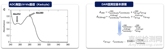 根據(jù)抗體部分和載荷部分的不同吸光度和消光系數(shù),依據(jù)Beer-Lambert原理計(jì)算出DAR值及ADC濃度,典型圖譜及計(jì)算方式舉例如下