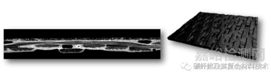 X射線CT掃描是一種非常通用的過程,可以在許多不同的材料上進(jìn)行,甚至可以在制造過程的不同階段進(jìn)行。上面的圖像顯示了尚未完全固化的預(yù)浸復(fù)合材料的高分辨率CT掃描。在左側(cè)的圖像(單個(gè)橫截面)中,較亮的區(qū)域是未固化的樹脂材料,內(nèi)部可以看到小的開口和空隙。這些數(shù)據(jù)也可以進(jìn)行數(shù)值分析,以提供更多的數(shù)據(jù),包括局部和更大范圍內(nèi)的纖維體積分?jǐn)?shù)。