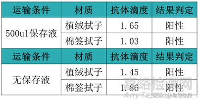 表4 植絨及棉拭子不同運(yùn)輸條件下的抗體釋放情況