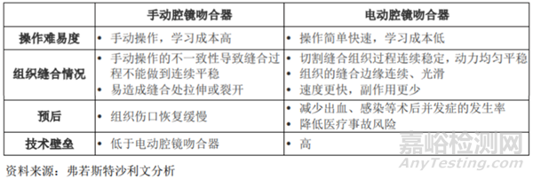 2.微創(chuàng)外科手術(shù)智能化是外科發(fā)展的重要方向,未來(lái)電動(dòng)腔鏡吻合器將逐步替代手動(dòng)腔鏡吻合器隨著中國(guó)醫(yī)療技術(shù)的不斷進(jìn)步,醫(yī)生與患者對(duì)外科手術(shù)器械操作便捷性與穩(wěn)定性、 手術(shù)效率與質(zhì)量、臨床預(yù)后等需求逐步提高,手術(shù)微創(chuàng)化、智能化是現(xiàn)代外科發(fā)展的必然趨勢(shì)。與手動(dòng)腔鏡吻合器相比,電動(dòng)腔鏡吻合器具有更多智能化功能,同時(shí)實(shí)現(xiàn)了操作的自動(dòng)化、標(biāo)準(zhǔn)化,降低了人為操作的差異和經(jīng)驗(yàn)影響,電動(dòng)腔鏡吻合器市場(chǎng)將持續(xù)增長(zhǎng)。對(duì)醫(yī)生來(lái)說(shuō),電動(dòng)腔鏡吻合器操作簡(jiǎn)單、使用安全高效;對(duì)患者來(lái)說(shuō),電動(dòng)腔鏡吻合器切割縫合過(guò)程連續(xù)平穩(wěn),更利于組織創(chuàng)口恢復(fù)和手術(shù)效果。因此電動(dòng)腔鏡吻合器有望在未來(lái)逐步替代手動(dòng)腔鏡吻合器。