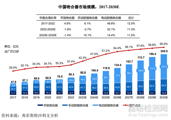根據(jù)弗若斯特沙利文分析,在國(guó)內(nèi),2022 年吻合器市場(chǎng)規(guī)模達(dá)到 86.3 億元,2017 年至2022 年復(fù)合增長(zhǎng)率為 12.5%,其中電動(dòng)腔鏡吻合器市場(chǎng)規(guī)模達(dá)到 28.2 億元,占總體的 32.7%,電動(dòng)腔鏡吻合器市場(chǎng) 2017 年至 2022 年復(fù)合增長(zhǎng)率為 48.8%;預(yù)計(jì)到2025 年,中國(guó)吻合器市場(chǎng)規(guī)模增長(zhǎng)至 118.9 億元,2022 年至2025 年復(fù)合增長(zhǎng)率為11.3%, 其中電動(dòng)腔鏡吻合器占比預(yù)計(jì)逐步提升,預(yù)計(jì)2025年增長(zhǎng)至65.1億元,占總體的54.8%, 電動(dòng)腔鏡吻合器市場(chǎng) 2022 年至 2025 年復(fù)合增長(zhǎng)率為 32.1%;預(yù)計(jì)到 2030 年,中國(guó)吻 合器市場(chǎng)規(guī)模進(jìn)一步增長(zhǎng)至 205.0 億元,2025 年至2030年復(fù)合增長(zhǎng)率為 11.5%,其中 電動(dòng)腔鏡吻合器市場(chǎng)規(guī)模預(yù)計(jì)進(jìn)一步增長(zhǎng)至 127.4 億元,占總體的 62.2%,電動(dòng)腔鏡吻合器市場(chǎng) 2025 年至 2030 年復(fù)合增長(zhǎng)率為 14.4%。