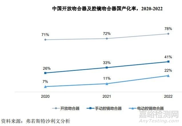 根據(jù)弗若斯特沙利文分析,2020 年至 2022 年,中國(guó)開(kāi)放吻合器國(guó)產(chǎn)化率從 71%提升至 78%,中國(guó)手動(dòng)腔鏡吻合器國(guó)產(chǎn)化率從 26%提升至 41%,中國(guó)電動(dòng)腔鏡吻合器國(guó)產(chǎn)化率從 7%提升至 22%。中國(guó)電動(dòng)腔鏡吻合器國(guó)產(chǎn)化進(jìn)程顯著加快。