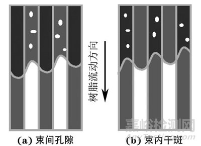 將樹脂流動(dòng)過(guò)程中黏性力和毛細(xì)管力的比值定義為修正毛細(xì)管數(shù),修正毛細(xì)管數(shù)決定了束間和束內(nèi)流動(dòng)前沿的相對(duì)位置。當(dāng)修正毛細(xì)管數(shù)較低時(shí),束內(nèi)流動(dòng)起主導(dǎo)作用,易形成束間孔隙(圖2a),也就是樹脂區(qū)孔隙類缺陷;當(dāng)修正毛細(xì)管數(shù)較高時(shí),束間流動(dòng)起主導(dǎo)作用,易形成束內(nèi)干斑(圖2b),也就是纖維束未被樹脂完全浸潤(rùn)的缺陷。