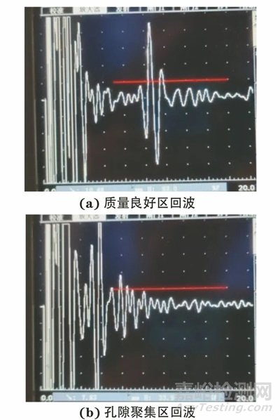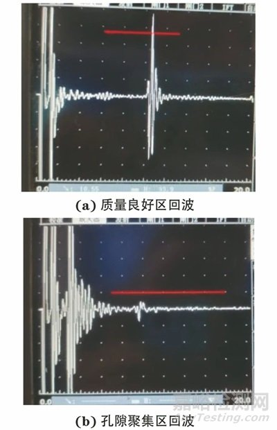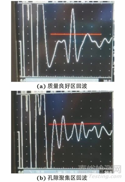 選取5 MHz縱波直探頭,采用脈沖反射法垂直入射方式對(duì)試樣進(jìn)行全覆蓋掃查,得到的典型波形如圖5所示。掃查中可見內(nèi)部質(zhì)量良好區(qū)的底面反射回波清晰,波幅較高;孔隙聚集區(qū)存在底波衰減現(xiàn)象,不同厚度處出現(xiàn)了孔隙回波。