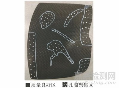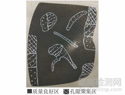 對(duì)試樣全覆蓋掃查后,對(duì)超聲異常區(qū)域用白色記號(hào)筆進(jìn)行標(biāo)識(shí),異常區(qū)域標(biāo)識(shí)如圖6所示,其中白點(diǎn)狀陰影部分為孔隙聚集區(qū),此部分區(qū)域編號(hào)為A區(qū)。