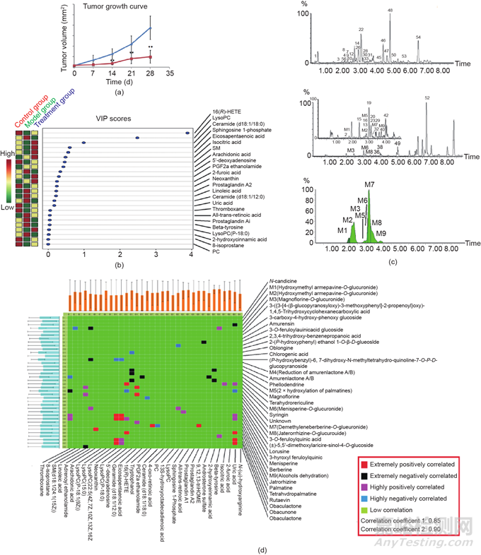 中藥成分的生物學(xué)活性評(píng)價(jià)是探索藥效物質(zhì)基礎(chǔ)的有效手段。最新研究利用中醫(yī)方證代謝組學(xué)開展關(guān)黃柏抑制前列腺癌的效應(yīng)研究并探索其活性成分(圖3)。結(jié)果顯示關(guān)黃柏可以抑制22RV1人前列腺癌細(xì)胞移植腫瘤的生長(zhǎng)[圖3(a)]。利用中醫(yī)方證代謝組學(xué)方法分析體內(nèi)成分和代謝標(biāo)記物,表征了關(guān)黃柏的54種化合物,發(fā)現(xiàn)了體內(nèi)38個(gè)化合物[圖3(c)]。辨識(shí)并鑒定了血清中29個(gè)原型化合物和9個(gè)代謝物,發(fā)現(xiàn)了34個(gè)生物標(biāo)志物與前列腺癌相關(guān);關(guān)黃柏可將代謝標(biāo)記物調(diào)整到正常水平,將代謝輪廓調(diào)節(jié)至健康狀態(tài)[圖3(b)],分析發(fā)現(xiàn)了10個(gè)入血成分與整體效應(yīng)高度相關(guān)[圖3(d)]。