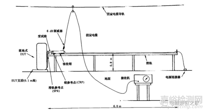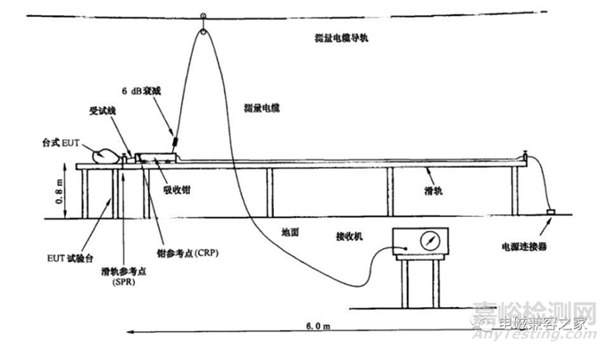 b) EUT盡可能地按照通常的工作位置放置在EUT試驗臺上。受試線應正對著吸收鉗滑軌的SRP布置。如無常規(guī)運行位置規(guī)定,EUT應放置在受試線正對吸收鉗滑軌的位置。EUT單元到SRP的距離應盡可能短。