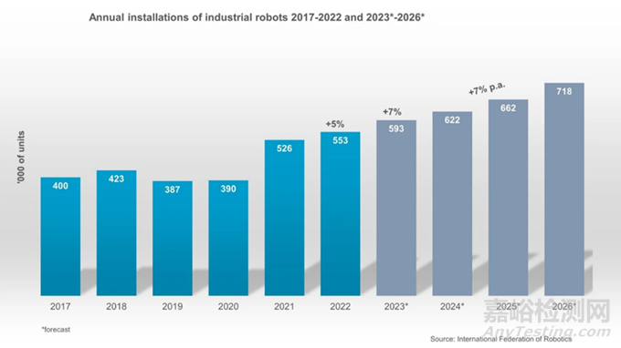 與新冠疫情之前相比,機(jī)器人需求仍處于較高水平。到2023年,全球機(jī)器人安裝量預(yù)計(jì)將增長7%,達(dá)到59萬臺以上。預(yù)計(jì)全球經(jīng)濟(jì)放緩將在2024年體現(xiàn)在機(jī)器人安裝上,但預(yù)計(jì)2025年增長率將略有加快,2026年將更加強(qiáng)勁。沒有跡象表明,整體的長期增長趨勢會在短期內(nèi)結(jié)束。事實(shí)恰恰相反。預(yù)計(jì)2024年將達(dá)到60萬臺,2026年將突破70萬臺??紤]到通貨膨脹和緊縮因素,北美市場預(yù)計(jì)每年平均增長7%。歐洲市場的中期前景大概率收到衰退的影響。亞洲市場將保持強(qiáng)勁。中國的機(jī)器人需求將繼續(xù)從非常高的水平以高速度增長。日本的機(jī)器人安裝將在2024年略有加速,并以高速度增長,預(yù)計(jì)韓國市場的增長率將達(dá)到中位數(shù)。