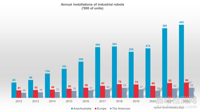 《世界機(jī)器人2023報(bào)告》報(bào)告記錄了全球工廠安裝的553052臺工業(yè)機(jī)器人,到2022年同比增長率為5%。按地區(qū)劃分,73%的新機(jī)器人安裝在亞洲,15%安裝在歐洲,10%安裝在美洲。