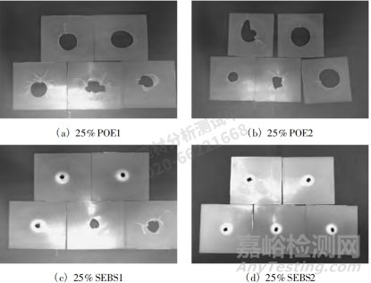 每個(gè)樣品測試了5 片,測試后的樣板照片見圖2。由圖2 可以看出: POE / PP 樣品在低溫多軸沖擊測試中都是脆性刺穿,樣板出現(xiàn)了不同程度的裂痕并產(chǎn)生碎片。