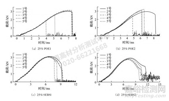 進(jìn)一步考察4 個(gè)彈性體/ PP 復(fù)合材料常溫沖擊強(qiáng)度最高時(shí)的低溫多軸沖擊性能,即針對添加質(zhì)量分?jǐn)?shù)為25%時(shí)的樣品進(jìn)行-30 ℃ 低溫多軸沖擊性能測試。